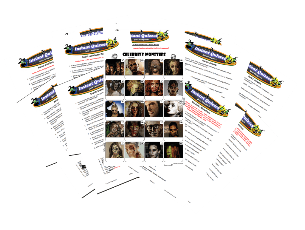 Our Halloween Picture Quizzes are great mini quizzes on their own or can be the perfect addition to a longer Halloween-themed pub quiz. They’re great at parties and charity events too! Check out the gallery below for a glimpse of all the picture quizzes we’ve uploaded for Halloween 2019: all available at Instant Quizzes!