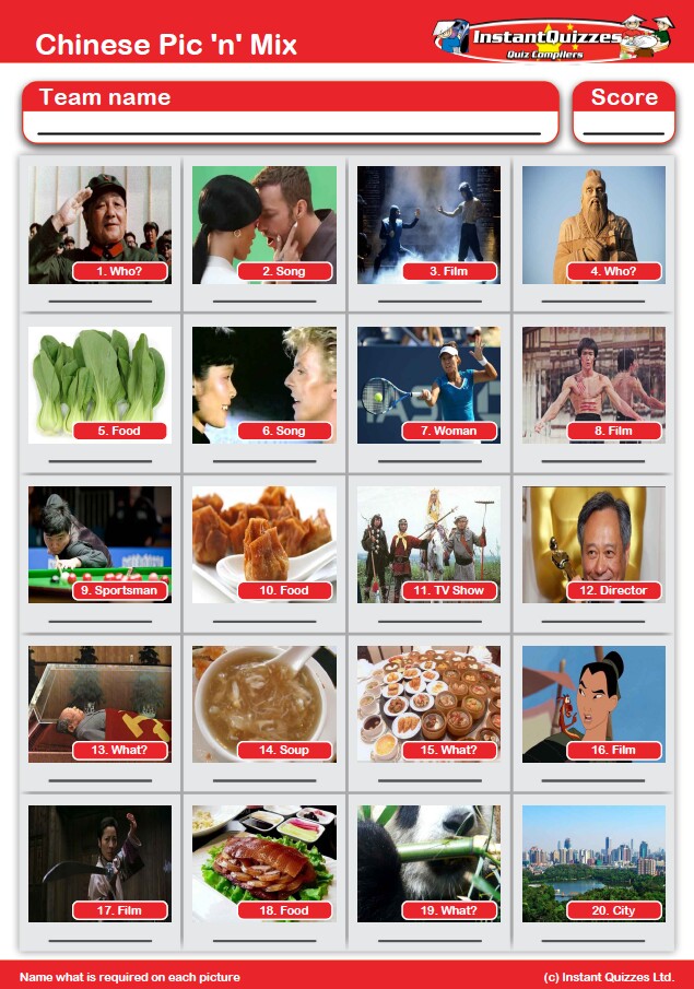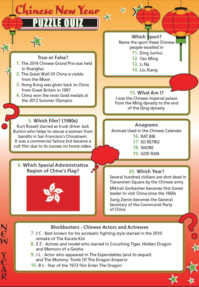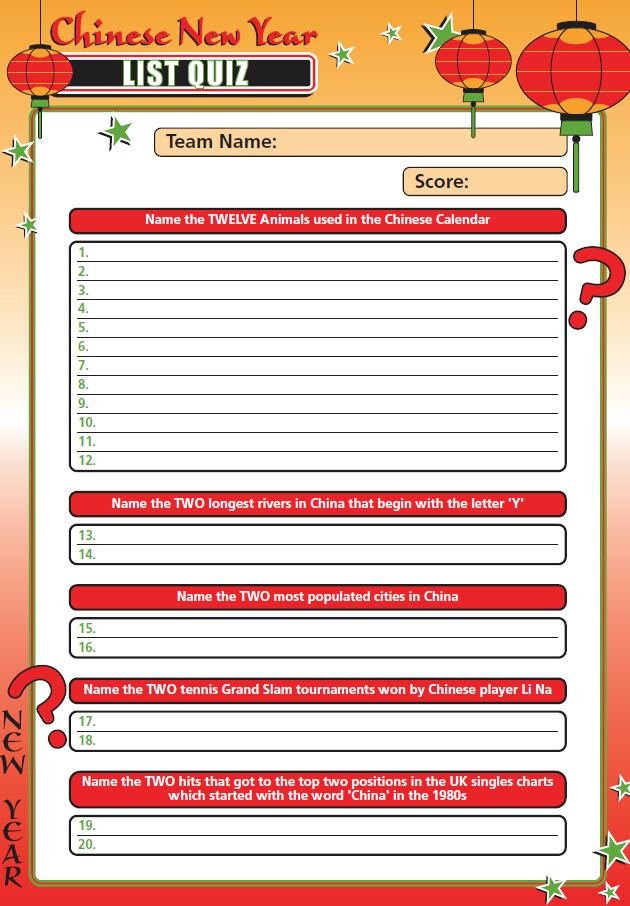 We also provide a selection of Chinese New Year Quiz Questions, in sets of 10, so you can build you’re own Chinese New Year Pub Quiz!