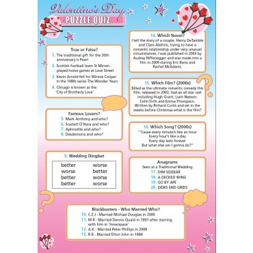 Or if none of them strike your fancy, why not try one of Valentine’s Day Handout Rounds instead? We’ve got Love Song Anagrams Quiz, with jumbled up titles of famous love songs for teams to identify. Alternatively, we have ‘I Love You’, the handout with those ubiquitous three little words translated into twenty languages, but which ones? We also have a Valentine’s Day Puzzle Quiz, with a mixed bag of puzzles and trivia for teams to work through for up to 20 points! Intrigued? See these and more at our Valentine’s Handout section!